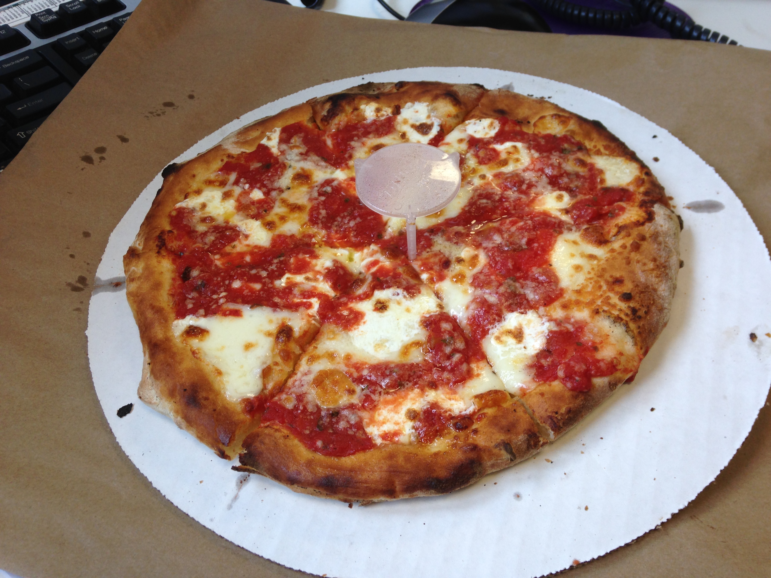 The menu was interesting but simple. Six pie offering, tomato, cheese, pepperoni, mushroom, buffalo chicken and buffalo Brussels sprouts (a big hit with the kids). Sticking with the Golden Rule, as always, I went with the cheese. I was there off hours so the line wasn’t too bad and I had my pizza in less than 10 minutes. I am interested to see how they handle a summertime lunch rush though. Back to the cube farm to dig in.